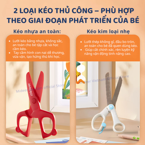 Kéo thủ công Mideer là lựa chọn an toàn và thông minh cho trẻ từ 3 tuổi trở lên, giúp bé làm quen với các hoạt động cắt dán sáng tạo một cách dễ dàng. Với hai phiên bản lưỡi nhựa và kim loại bo tròn, sản phẩm phù hợp với từng giai đoạn phát triển kỹ năng của bé. Thiết kế tay cầm hình con nai dễ thương, lưỡi dao nhẹ, cơ chế tự bật lại cùng chất liệu nhựa PP cao cấp giúp bé cắt mịn, an toàn và thoải mái. Đây là dụng cụ không thể thiếu trong góc học tập thủ công tại nhà hoặc ở lớp học mầm non.