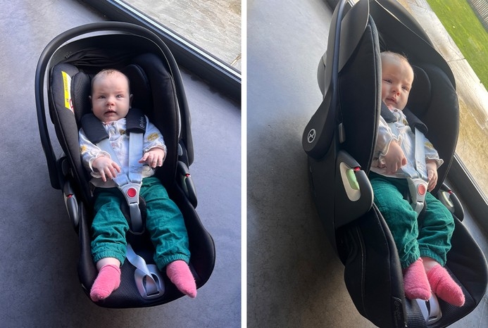 Khi gắn lên khung xe đẩy của Cybex, ghế có thể ngả gần như hoàn toàn, giúp bé sơ sinh có tư thế nằm thoải mái như trên nôi. -