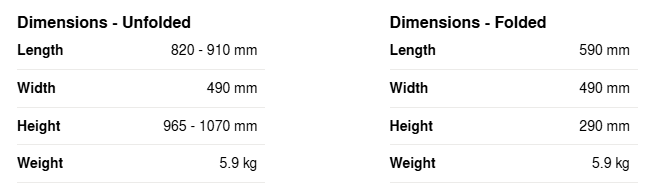| Kích thước khi mở | 82 – 91 x 49 x 96.5 – 107 cm |