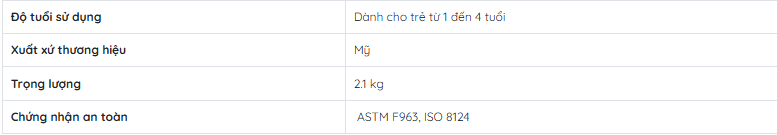 - Chứng nhận an toàn: ASTM F963, ISO 8124